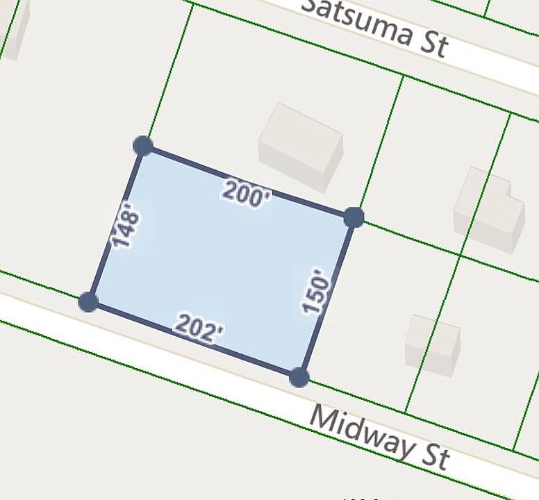 I am selling two lots together. One has 202' road frontage on Midway Street and the other has 200' road frontage on Satsuma Street. The two properties total about 1.31 acres (57184 soft) together.