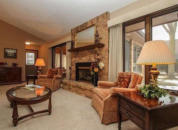 Beautiful , brick 1 level twinhome. Awesome 4 season porch, open flr plan w/vaulted ceiling, natural woodwork, gas brick fpl & ceramic/wood flooring. Bedrooms have lge walk-in closets. Oversize garage w/huge storeroom. Convenient to Hwys, shops & food.