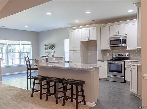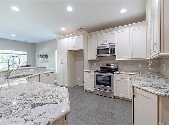 Beautifully renovated home in the heart of hot hot Blakeney! Open floor plan with high ceilings and bright natural light. Chef's kitchen offers granite and stainless appliances with a huge island. Eat in kitchen overlooks large, private flat back yard that backs up to woods. Large formal dining area off the kitchen and living room. Spacious master suite offers beautiful custom wood accent wall, large walk in closet, and luxurious en suite bath. New flooring, new paint throughout. 3 additional bedrooms. Bedrooms 3 and 4 have a French door sized finished cut out so feels like bedroom/ office suite, but can easily be closed in again. Culdesac lot that backs up to woods.. have coffee on the back deck and see the deer in the am outside your fully fenced private back yard. Blakeney is a very popular area of Ballantyne with walkability to shopping and restaurants, close to Stonecrest and Blakeney hot spots, and easy access to interstates.
