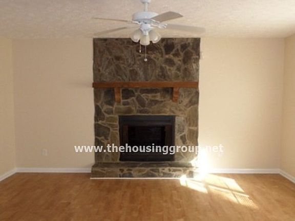 Ranch style home with 780 square feet of basement space, hardwood flooring, black appliances in kitchen with extra cabinet space, fireplace for cold winter days and a large patio.