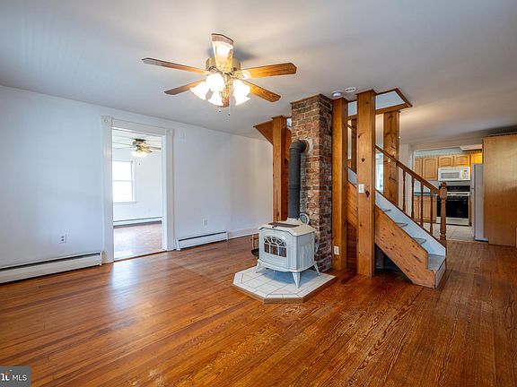 Charming Victorian in the heart of Savage. This 3 bedroom, 2 bath home features a welcoming, covered front porch. Front living room with wood stove. Rear kitchen with light wood cabinets, Corian counters, porcelain sink, and ceramic tile flooring. Front primary bedroom with attached bath. Rear family room with walkout to paver patio. Upper level features 2 more bedrooms and second full bath. Hardwood flooring and ceiling fans throughout. Detached garage with electric. Large, flat and fully fenced backyard. Walking distance to Savage Mill and close to schools, shopping and all major routes. This home is a must see. Sold As-Is.