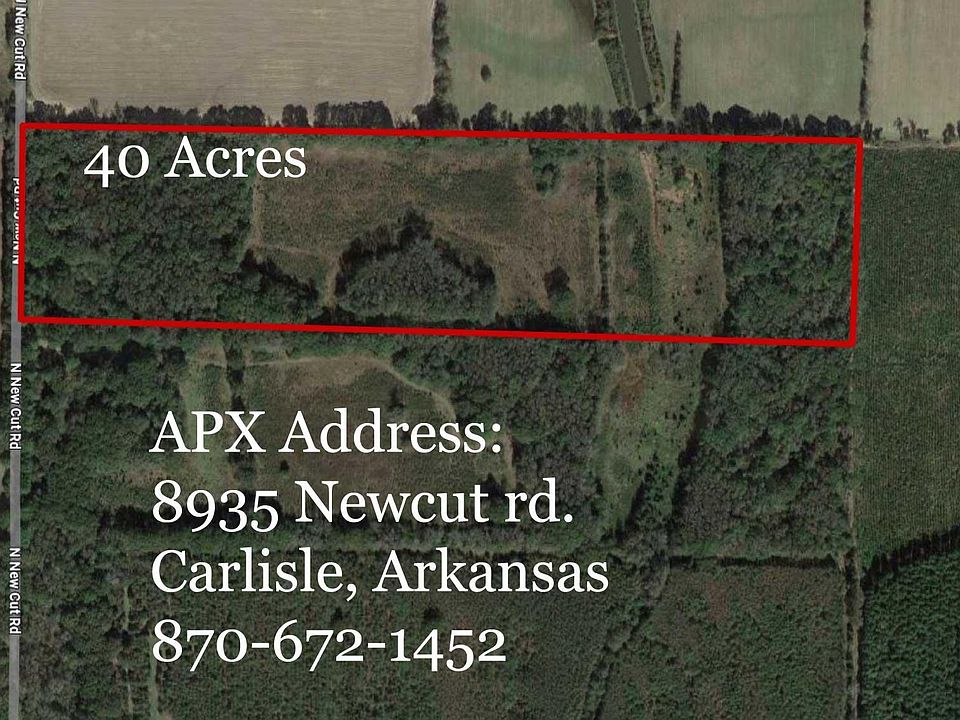 8935 Newcut rd., Carlisle, Arkansas. The Address is approximate. 40 acres of wooded land, Main city water line is at edge of property and First Electric is across the road frontage. They also have fiberoptic internet service. The property is 660' road frontage wide and 1/2 mile deep with an old homestead, mostly wooded, unrestricted land. Deer hunting is a plus in this area with a small pond within the woods. Would make a nice place for a home, cabin, lodge and or a place to hunt and relax. An additional 40 acres is available if you want 80 total acres making the frontage 1320' and 1/2 mile deep. If you want the full 80, call us for pricing. Call us today for more information. Thanks, Samuel Parham. 4.3 Miles to Hickory Plains, 12.2 Miles to Carlisle, 18 Miles to Cabot, 15.3 Miles to Beebe, 18.3 Miles to Des Arc, No owner financing, No leasing, No rent to own.