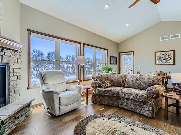 Lovingly maintained walk-out rambler - feels like new construction! Boasting 4 generous bedrooms, 3 elegant baths, & attached 3 car garage. Soaring vaults, engineered wood floors, screened porch w/ access from owner’s suite & living room. Chase the chill with the stone-surround gas fireplace. Creature comforts include under-cabinet lighting, tile backsplash, dual sinks in owner’s bath, walk-in closets, custom lighting with dimmers, auto-close garage door, irrigation system, & composite decking. 4th bedroom is perfect for workshop or home-based business! Nestled onto a gorgeous lot w/ custom native landscaping that offers bursts of bloom, texture & color in all seasons. Perfect habitat for birds & pollinators; the fireflies in summer are magical! Minimal maintenance yard without HOA fees! Back yard partially fenced & accessible from the walkout lower level. Wetland views abound; enjoy the natural setting & abundant wildlife. Just 35 miles from Minneapolis/St. Paul. 1-Year Home Warranty!