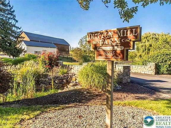Welcome to Dutton Mill – A Modern Farmhouse Retreat in Fogelsville nestled on 10 manicured acres. The 3,200 sq ft. home features 4 bedrooms, two are primary suites, and 3.5 baths, built in 2010 and fully renovated with meticulous attention to detail. Step inside to discover a light-filled interior with soaring 16-foot ceilings where classic farmhouse character meets contemporary design. The open-concept main level is flooded with natural light & features a spacious living area w/ a gas fireplace set in stone with a reclaimed red oak beam mantel from the original barn, a sunroom and dining area. The chef’s kitchen is a true centerpiece boosting weathered granite island, s/s appliances, a Viking 6 burner gas stove, handcrafted backsplash, rustic brick flooring, & a spacious walk-in pantry, perfect for everyday meals & entertaining. Outdoors, the wraparound front porch invites you to start your day w/ sunrise views, while the private covered back patio off the first-floor primary suite offers a serene space to unwind w/ picturesque farm vistas. For equestrian enthusiasts or hobby farmers, the property is fully equipped w/ a 3-stall barn, fenced pastures, a riding ring, and dedicated pump house—making it a true working farm. Attached 2-car garage + 4-car detached garage. Surrounded by mature landscaping, a stream, manicured gardens & a fruit orchard. Dutton Mill presents an exceptional opportunity to embrace peaceful rural living without compromising on modern comforts.