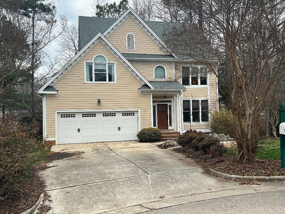 A BIG home in Desirable Oak Chase. Quiet & beautiful neighborhood full of trees & wildlife. This home is a 5 BR, 3 1/2 bath home nestled on a quiet cul-de-sac lot. Fenced in backyard, can be enjoyed from covered back deck. Huge Daylight Basement, with large family room and gas fireplace, full Bath, int. and ext. entrance to bedroom or home office. Features includes: 2 story entry foyer, smooth ceilings, custom trim & moulding, hardwood floors, 2 fireplaces gas + wood, formal areas & custom blinds. Kitchen has lovely granite counter tops, custom shelf genie cabinets, stainless steel appliances, double oven, farm sink and opens into breakfast area + family room. Home has tons of storage, cabinets & good flow. Gigantic Walk-up Attic. 2-car garage. Wooded, private backyard with fire pit. Tankless water heater. 5 min. walk to Kraft YMCA. 25 minutes to RTP. No City Taxes, Low HOA fee. Seller Credit in Agent Remarks