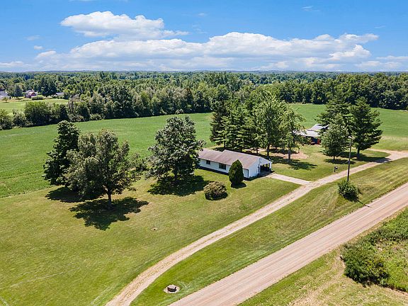 Country rancher with a compact footprint sports an open kitchen/dining room combo. Three bedrooms and a glass tile bath are adjacent to the sizable living room which has a heated floor. The windows bring in natural light and nature views. Attached car port keeps the elements off your vehicle. A few unfinished interior projects to keep the handy busy. Forget a long day hanging out on the brick paver patio. The firepit is perfect for s'mores. Camper hook up not too far away. The barns provide a space for woodworking, back yard mechanics, farm animals and tons of storage. The farmable acres are currently rented for additional income.