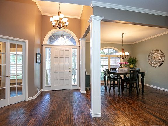 Magnificent home in Southern Pointe that backs to greenbelt with mature trees and neighborhood sidewalks, light and bright open floor plan with beautiful hand scraped wood floors, floor to ceiling windows in formal living, dining and family room with fireplace that is open to kitchen and large eating area, private office and master suite down, 3 BRS up (one with private bath), covered back patio with balcony, fully fenced backyard, wonderful curb appeal. 2019-07-29