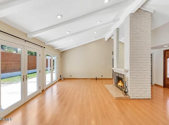 This 4 bed, 2.5 bath home has a midcentury feel with a few modern touches. The floorplan offers space for entertaining with a kitchen that opens to the living area. The large windows and french doors brighten the room with natural lighting and open up to the backyard area with a pool. Through the kitchen to the dining and additional living room are vaulted ceilings, recessed lighting, and another set of glass doors leading to another section of the backyard. Down the hall are all the bedrooms, offering a sense of privacy away from the common areas.