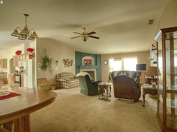 Affordable living at it's best! This home has a very open floor plan with vaulted ceilings. Kitchen is good sized w/ an island for additional work space. Large walk in pantry off the laundry area. New roof, furnace/heat pump and carpet in living room and master bedroom within the last 2 years. 2 storage sheds, covered patio, covered deck and fenced yard. Close to shopping!