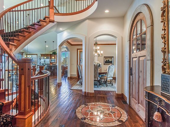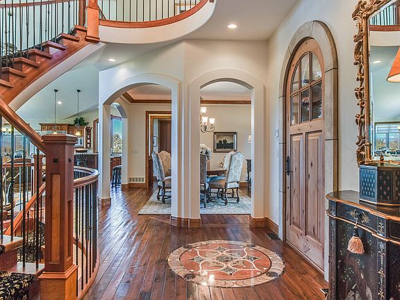 The Perfect Blend of European Architecture and New World, Court Yard at Entry, Stone, Cast Stone, Stucco and Iron give you that Old World feel. Upon entering the Foyer the perfectly crafted curved staircase makes a statement. The Great Room and well appointed Kitchen with extensive wood cabinets, offer expansive views of the Front Range and Golf Course. There is a Butler Pantry and Serving Bar and Formal Dining Room perfect for entertaining. The main floor Master Suite w/spa style bath, walk-in closet, private entry to covered stamped Concrete Deck. The Main Floor also features a Guest Suite with private entry from Garage, a well appointed Study. The finished lower level includes an additional 2 bedrooms, 2 baths, game room, wet bar, wine grotto, wine room, Theater Room and access to the lower level patio. An incredible lot overlooking a waterway and multiple fairways. All major rooms in this home overlook the fairways. One of the few homes with Mountain, Water and Golf Course Views!