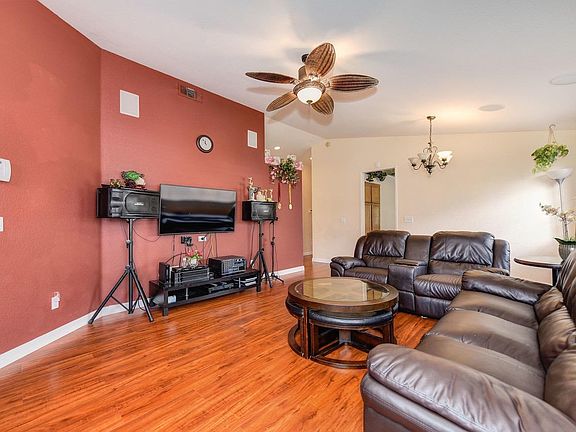 Very desirable neighborhood and great floor plan! Separate living room and family room. Newer beautiful counter with Stainless steel appliances in kitchen. All wood floor or tile through the traffic area. Large Patio cover in backyard with custom pulldowns. Most rooms are wired for sound. Huge 3 car garage with DRIVE-THRU! Move in ready! Come to see to believe it!