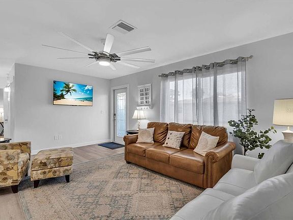 One or more photo(s) has been virtually staged. Move in ready. This single-family residence has been extensively renovated and is situated within a small, age-restricted community for individuals aged 55 and older. The homeowners association (HOA) fee of $80 a month includes select exterior maintenance services such as lawn care, roof cleaning and painting, and upkeep of the private road. The residence features an open floor plan with new flooring, shiplap walls, updated lighting fixtures, and ceiling fans throughout. The eat-in kitchen is equipped with stainless steel appliances, new cabinetry, solid surface countertops, and a tile backsplash that extends to the ceiling. The home contains two updated bathrooms and an oversized, stackable stainless steel washer and dryer located within the unit. Several windows have been replaced with impact-resistant models, and the front door has also been upgraded with an insulated door. Bedroom closets are fitted with barn-style doors, and all windows are furnished with drapes. The furnishings in the home including the bedding are also new. The furnishings are optional. Recent renovations include a new kitchen, solid surface countertops, windows and new flooring throughout the residence. The wall separating the kitchen and living room has been removed to create an open layout. Additional improvements comprise of new windows, updated plumbing and electrical, and in 2022 the air conditioning (HVAC) system, new interior doors, wood trim, and an insulated front door with nice glass front and password access. Conveniently located near shopping and restaurants. It is approximately 5 min to Warm Mineral Springs, 20 min to Englewood Beach, and under a half hour to Downtown Venice, Venice Beach, Sharky's, the Venice Fishing Pier and Dog Beach.