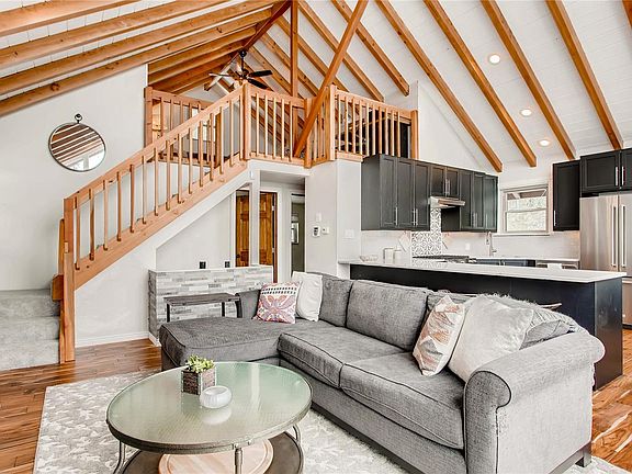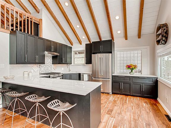 Wake up every morning & enjoy a cup of coffee on your front deck while gazing straight at Mt. Evans in this delightful mountain retreat. Surrounded by pine trees, this quintessential mountain home affords you privacy while still allowing enjoyment of breathtaking mountain views. The A-frame wall of windows brings the outside in & provides passive solar heating during the Winter. The vaulted, tongue & groove ceilings were completely refinished w/ added recessed lighting. The kitchen was completely remodeled w/ quartz counter-tops, new cabinets & appliances. Above is an open loft that's ideal for a home office or 3rd bedroom. The main-floor master has French doors leading to your back deck where you can enjoy evenings in the hot tub. In the basement, you'll find an open living area with a full bath, wood-burning fireplace & French doors leading to the front yard. Backyard includes 6' fence with bear-proof latching gates. So many upgrades! Come see this special home before it's gone!