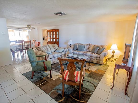 Super cute home perfect for first timers, snow birds or just anyone wanting a clean, well cared for home. This home features two large bedrooms and two full baths. The master bedroom has an additional 7'x8' of closet space not included in listed square footage. You will enter the front door into the formal living room with dining room just beyond that. You can see out the sliding glass doors into the covered screened porch out to the beautifully landscaped and fenced in yard. The Bedrooms are on the north side of the home and the kitchen, family room are on the opposite side. Ceramic tile throughout the home. Plenty of space in the garage for storage and laundry. Current owner has only lived here part time and has painted and freshened up inside and outside. Furnishings are negotiable.