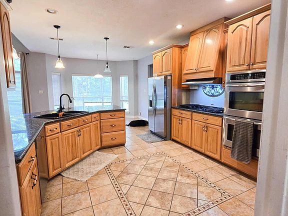 Kitchen: Features a breakfast bar, gas cooktop, double oven, and electric oven.