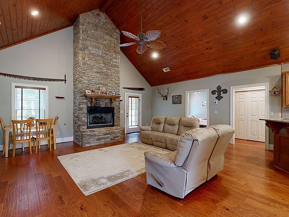 Welcome to this beautiful 1613 sf single-level home with a 936 sf versatile bonus room over the 3-car garage, ideally located on County Road 379; just a half mile before the iconic Long Bridge. Step inside to find engineered wood floors guiding you through a warm and welcoming open concept living space. The vaulted family room features a tongue-and-groove ceiling and a cozy stone gas log fireplace with hearth and mantel. A half bath is conveniently located off the entry, ideal for guests. The kitchen boasts granite countertops, a raised eat-at bar, and a full complement of stainless-steel appliances. The Master bedroom features wood floors, a double vanity ensuite with jetted tub, a separate tile shower, and walk-in closet. A split-bedroom layout provides two additional bedrooms connected by a Jack-and-Jill bath with double vanity. The hall laundry closet comes complete with washer and dryer, and the home is equipped with a central vacuum system for added convenience. Step out back to enjoy the oversized patio and spacious backyard—perfect for outdoor play or entertaining. A sidewalk leads to the detached 3-car garage, where upstairs you'll find a spacious 932 sq ft bonus room with its own half bath—ideal for a guest suite, home office, or hobby space. Located just one mile from the Long Bridge boat launch and less than a mile from the Country Market, this home offers the perfect blend of comfort, space, and proximity to all that Lake Harding has to offer.