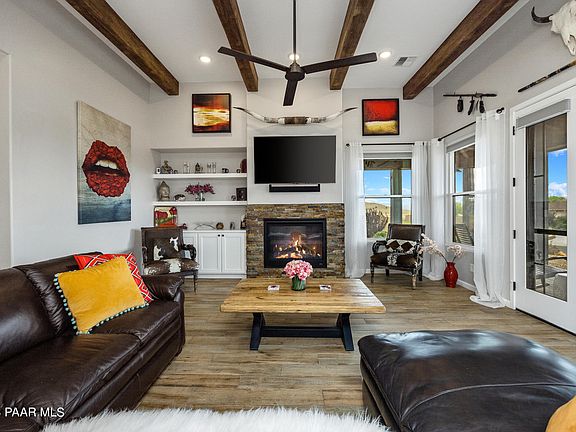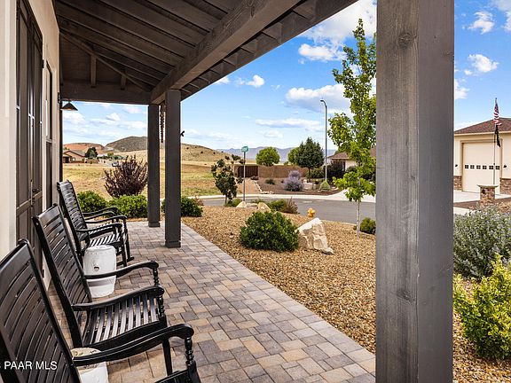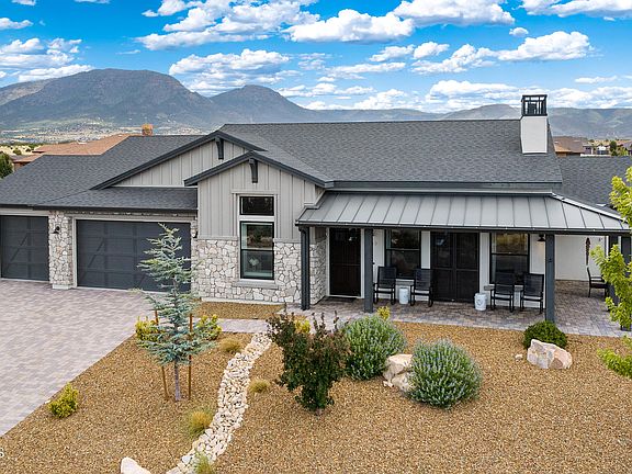Prepare to be awestruck by this stunning single-level masterpiece, built by Gardner Custom Homes nestled within the coveted Mingus West neighborhood of Prescott Valley. Impeccably designed and custom-built, this home goes beyond the realm of ''new,'' embracing a level of excellence that is simply unparalleled. From the moment you lay eyes on this home, its outstanding curb appeal and captivating stack stone accents and partial metal roof, set the stage for the extraordinary. Positioned perfectly on an elevated homesite, it's a vantage point to behold, offering panoramic views that stretch in every direction. Gaze upon the majesty of Mingus Mountain, the grandeur of the Bradshaw Mountains, the allure of Granite Mountain, Glassford Hill, and the twinkling lights of the city--all from the