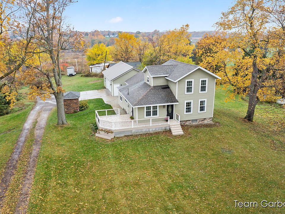 Welcome to your perfect country retreat in Byron Center! This beautifully updated 3-bedroom, 2-bathroom farmhouse sits on 6 sprawling acres. The main floor features a owner's suite with a walk-through bathroom, providing both convenience and privacy. The bathroom has been tastefully updated with heated tile floor. Which is extended through into the kitchen area. The heart of this home is the updated kitchen, with its ample counter space, stylish slate appliances, and a central island that's perfect for meal prep and gatherings. The kitchen flows seamlessly into the adjacent dining area, making it ideal for entertaining. You'll find not one, but two cozy living rooms on the main floor, each with its own unique charm. Step outside to enjoy 6 acres of pure outdoor bliss. The property includes a newly built 24x30 outbuilding, providing ample storage space for all your needs. Whether you're looking to start a hobby farm or simply enjoy the peaceful countryside, this acreage offers endless possibilities. Located within the highly regarded Byron Center school district, this property is the perfect blend of modern comfort and timeless farmhouse charm. If you've been dreaming of a spacious country home with room to breathe, this is your opportunity. Don't miss your chance to make this your forever home.