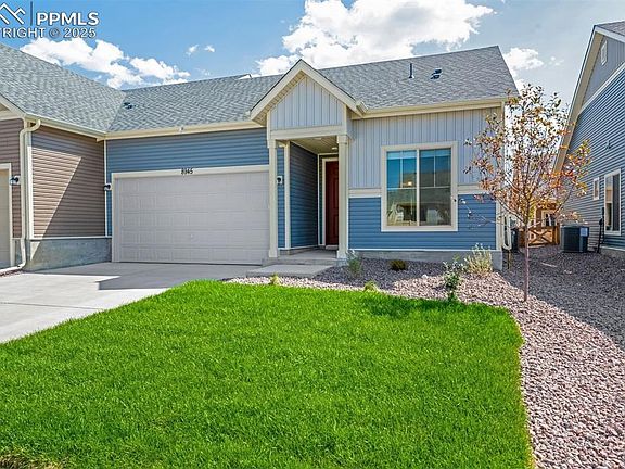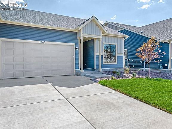Introducing the Santorini, a contemporary, easy-maintenance home in a gated 55+ resort-style community in Banning Lewis Ranch. The Santorini is a single-level layout designed for efficiency, affordability, and comfort, perfectly suited for the active adult lifestyle. This duet-style, open-concept home spans 1,246 sq. ft. and offers 2 beds, 2 baths, great room, dining room and a 2-car garage. With plenty of curb appeal, it features a multi-textural exterior, a charming front porch, and included landscaping with sprinklers. The interior is bright with oversized windows and arch-detailed 9’ ceilings. The kitchen features an eat-in dining island, a chef’s window, along with a walk-in pantry, and flows seamlessly into the living area and out to the back patio — ideal for entertaining and family gatherings. The spacious primary suite boasts a large walk-in closet, double vanity sink, and a tiled spa shower.