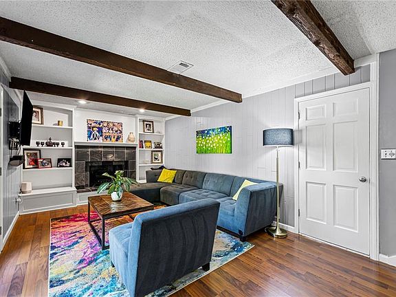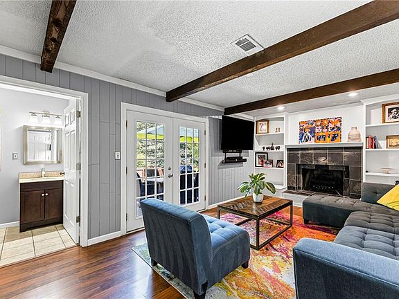 The primary suite offers a true sense of retreat with a private bath that includes dual sinks, granite counters, and a spacious walk-in closet. The remodeled eat-in kitchen, positioned just off the deck, pairs stainless-steel appliances with granite countertops and a custom tile backsplash. The layout flows seamlessly into both a formal living room and a warm, inviting family room with built-in shelving and a brick fireplace.