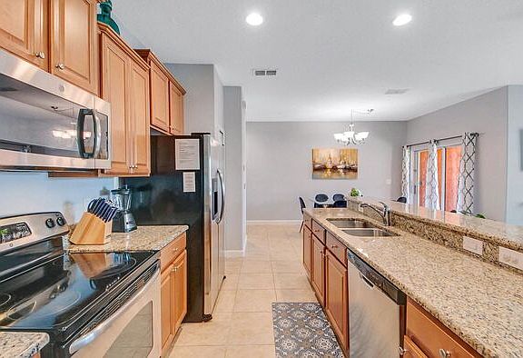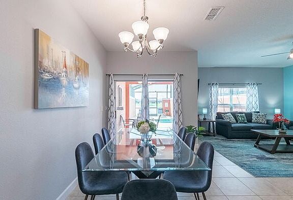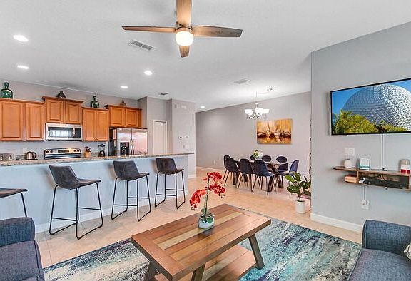 This property is a corporate rental. Please note that the monthly rental price for this property is dynamic and subject to seasonal adjustments. For an accurate quote, provide us with your intended move-in and move-out dates. Paradise Palms Resort Vacation Townhome - includes resort clubhouse amenity access! Our 4 bedroom, 3 bathroom, private vacation townhome is a great option for families wanting a home base to enjoy the best of all that Central Florida has to offer. * Paradise Palms Resort Private Townhome with Splash Pool, Sleeps up to 10 * 4 bedrooms / 3 bathrooms * Private Splash Pool - South Facing * Paradise Palms Resort Gated Community * 5 miles to Disney World property * Fully equipped Kitchen with seating for 8 at the dining table, and additional seating for 4 at the kitchen counter * Pet-Friendly! (with fee, see below)* BEDROOMS (First Floor) - Bedroom 1: One King Bed BEDROOMS (Second Floor) - Bedroom 2: One Queen Bed - Bedroom 3: Two Double Beds - Master Suite 4: One King Bed / Attached Bathroom * This is a pet-friendly home! An additional non-refundable cleaning fee of $150 plus tax will apply when you let us know you\'re bringing your dog. There is a two-dog limit. Pet must be disclosed and the additional fee must be paid prior to arrival. Pool Charges and Information: * There is an additional optional charge of $20 per day plus tax to heat the pool. * Please note that our pools are serviced on a weekly basis. Resort Parking Rules: The resort allows a maximum of 3 cars per townhome. Each townhome has its own numbered parking spaces. You may park on your unit\'s numbered spots or any other unnumbered spots. Paradise Palms Resort Amenity Access Included with Rental: * Massive 5,000 sq. ft. pool * Luxurious hot tub * Exciting water slide * Paradise Palms tiki bar * 50-seat movie theater * State-of-the-art fitness center * Sundry shop * Game room * Internet lounge * Basketball courts * Sand volleyball courts * Lighted tennis courts Distances from Resort to Shopping & Attractions: * Walt Disney World - 5 miles * Universal Studios - 19 miles * SeaWorld - 15 miles * Orlando Airport - 27 miles * Atlantic Coast Beaches - 75+ miles * Gulf Coast Beaches - 92+ miles * Publix Supermarket - 2 miles * Walmart - 3 miles * Dining - 1 mile Why Choose this Rental? * Professionally managed to serve all your needs * Management company has over 26 years of experience hosting well over 200,000 families * Go straight to your rental with online email check-in * 24/7 on-call maintenance * No Resort Fees * Free On-Site Parking * Smoke-free and pet-free for your comfort * Towels and linens are provided * Complimentary WiFi * Additional Rental items Available (e.g., 3 & 4 burner BBQs, cribs, pack-n-plays, strollers, high chairs, etc.) Our Starter Welcome packet supplies: * 2 rolls toilet paper per bathroom * 2 round hotel-size bar soap per bathroom * 1 hotel-size shampoo/conditioner per full bathroom * 1 roll paper towel * 1 packet dishwasher detergent * 2 trash bags size-13-gallon * 1 small box laundry detergent (enough for one load) * Garbage can liners in each bedroom/bathroom small garbage cans * Any supplies beyond this are up to the guest to replenish, we do not restock these items. * No salt/pepper or cleaning supplies are stocked due to safety issues. This is an industry-standard practice. FOR GUESTS WHO BOOK 30 NIGHTS OR LONGER STAYS: (this does not apply if you are staying less than 30 nights) We will collect a $1,500 deposit. Balance is due 60 days prior to arrival If canceled 90 days or more before arrival, we keep with us $250.00. $1,250.00 will be refunded. If canceled between 61 and 89 days prior to arrival, we keep with us the $1,500.00 deposit. No cancellation or modification 60 days or less prior to arrival. Contact us to schedule a showing.