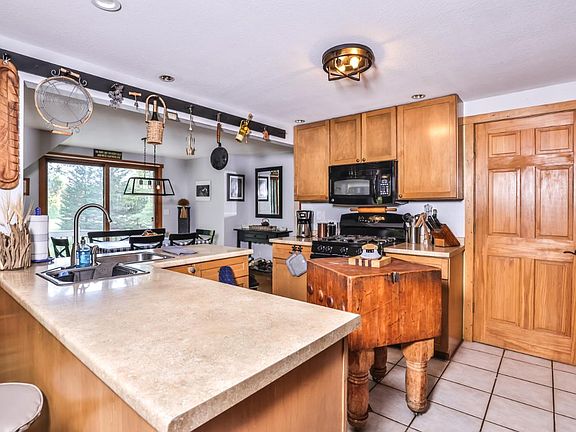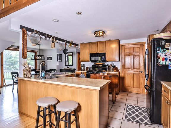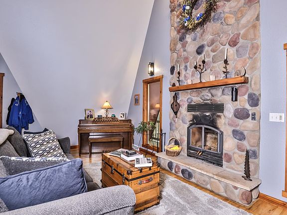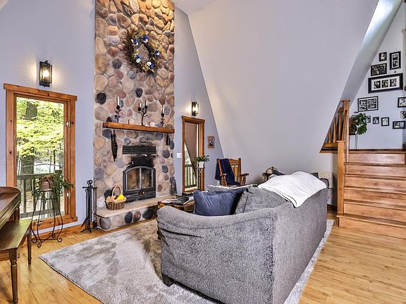 Close to everything and move in ready home! This modified A-frame is sure to please. Open concept main floor. Living room features beautiful fieldstone wood burning fireplace. Kitchen is a chef's dream with newer all black GE profile appliances and nice sized dining room. Huge decks on both sides of the home for plenty of outdoor living plus fire pit area. Fresh paint and new light fixtures throughout.New Gas water heater. Central air and gas furnace 2012. Upper level features open large open loft plus primary suite. Basement includes recreation room, bar room with gas fireplace, office, storage, and laundry. Oversized two car insulated and heated garage for all your toys. Gorgeous corner lot.