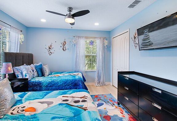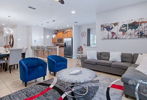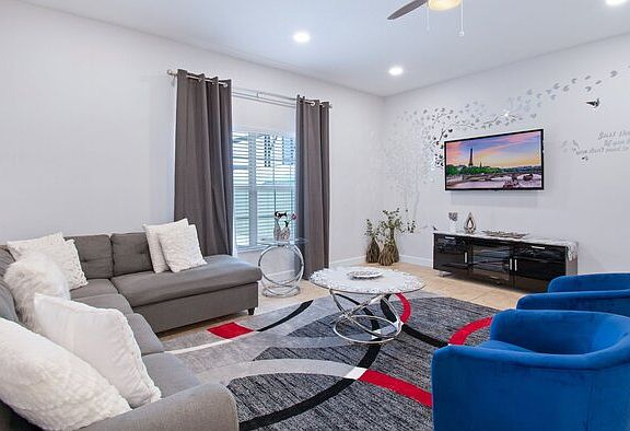 This property is a corporate rental. Please note that the monthly rental price for this property is dynamic and subject to seasonal adjustments. For an accurate quote, provide us with your intended move-in and move-out dates. Paradise Palms Resort Vacation Townhome - includes resort clubhouse amenity access! Our 5 bedroom, 4 bathroom, private vacation townhome is a great option for families wanting a home base to enjoy the best of all that Central Florida has to offer. * Paradise Palms Resort Private Townhome with Splash Pool, Sleeps up to 10 * 5 bedrooms / 4 bathrooms * Private Splash Pool - North Facing * Themed Bedrooms * Paradise Palms Resort Gated Community * 5 miles to Disney World property * Fully equipped Kitchen with seating for 8 at the dining table, and additional seating for 4 at the kitchen counter BEDROOMS (First Floor) - Bedroom 1 - One Queen Bed / 39\" Smart TV - Bedroom 2 - Two Twin Beds / 32\" Roku TV BEDROOMS (Second Floor) - Master Suite 3 - One King Bed / Attached Bathroom / 46\" TV - Bedroom 4 - Two Twin Beds / 39\" Smart TV - Master Suite 5 - Two Double Beds / Attached Bathroom / 39\" Smart TV A pack\'n\'play is available for use as well. Pool Charges and Information: * There is an additional optional charge of $20 per day plus tax to heat the pool. * Please note that our pools are serviced on a weekly basis. Resort Parking Rules: The resort allows a maximum of 3 cars per townhome. Each townhome has its own numbered parking spaces. You may park on your unit\'s numbered spots or any other unnumbered spots. Paradise Palms Resort Amenity Access Included with Rental: * Massive 5,000 sq. ft. pool * Luxurious hot tub * Exciting water slide * Paradise Palms tiki bar * 50-seat movie theater * State-of-the-art fitness center * Sundry shop * Game room * Internet lounge * Basketball courts * Sand volleyball courts * Lighted tennis courts Distances from Resort to Shopping & Attractions: * Walt Disney World - 5 miles * Universal Studios - 19 miles * SeaWorld - 15 miles * Orlando Airport - 27 miles * Atlantic Coast Beaches - 75+ miles * Gulf Coast Beaches - 92+ miles * Publix Supermarket - 2 miles * Walmart - 3 miles * Dining - 1 mile Why Choose this Rental? * Professionally managed to serve all your needs * Management company has over 26 years of experience hosting well over 200,000 families * Go straight to your rental with online email check-in * 24/7 on-call maintenance * No Resort Fees * Free On-Site Parking * Smoke-free and pet-free for your comfort * Towels and linens are provided * Complimentary WiFi * Additional Rental items Available (e.g., 3 & 4 burner BBQs, cribs, pack-n-plays, strollers, high chairs, etc.) Our Starter Welcome packet supplies: * 2 rolls toilet paper per bathroom * 2 round hotel-size bar soap per bathroom * 1 hotel-size shampoo/conditioner per full bathroom * 1 roll paper towel * 1 packet dishwasher detergent * 2 trash bags size-13-gallon * 1 small box laundry detergent (enough for one load) * Garbage can liners in each bedroom/bathroom small garbage cans * Any supplies beyond this are up to the guest to replenish, we do not restock these items. * No salt/pepper or cleaning supplies are stocked due to safety issues. This is an industry-standard practice. FOR GUESTS WHO BOOK 30 NIGHTS OR LONGER STAYS: (this does not apply if you are staying less than 30 nights) We will collect a $1,500 deposit. Balance is due 60 days prior to arrival If canceled 90 days or more before arrival, we keep with us $250.00. $1,250.00 will be refunded. If canceled between 61 and 89 days prior to arrival, we keep with us the $1,500.00 deposit. No cancellation or modification 60 days or less prior to arrival. Contact us to schedule a showing.