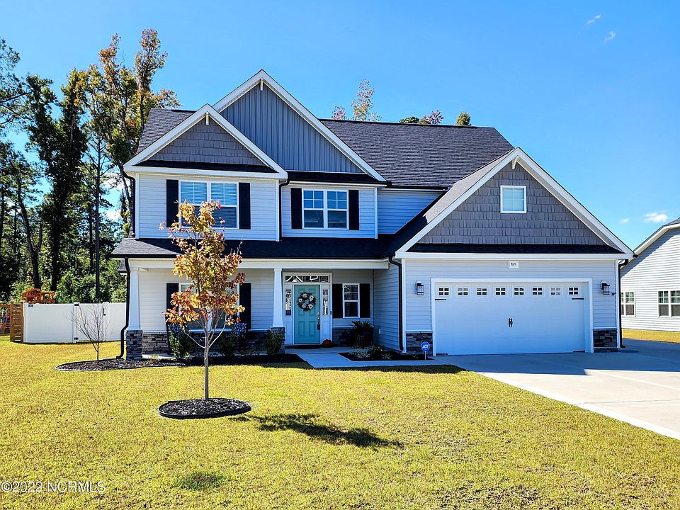 Truly better than new, immaculate 5 bedroom, 3 1/2 bath home. So many extras to enjoy! Yes, this is the house with the awesome driveway that is the envy of the neighborhood! The concrete driveway extends to the right of the house with parking for 7-8 cars. This home is the Trent by Caviness & Cates, 3100 square feet with the primary bedroom suite downstairs. Upon entering the home, the two story foyer is sure to impress, LVP flooring throughout the first floor including the primary bedroom suite. Large open concept living room, dining room and kitchen with lots of natural light. An impressive sized island will provide ample seating for large gatherings. The kitchen boasts upgraded granite countertops, white cabinetry, recessed lighting, pendant lighting over island, tiled backsplash and stainless steel appliances. The main floor also features powder room, mud room, laundry room. The primary bedroom suite is spacious with a walk-in closet dual vanity, soaker tub, and stand alone shower. Upstairs you will find a loft and 4 additional bedrooms which are separated by jack-n-jill bathrooms each having upgraded glass shower doors. The large unfinished storage room makes this floor plan one of the most versatile plans, perfect for intergenerational living. Carpets upstairs have upgraded thicker padding.