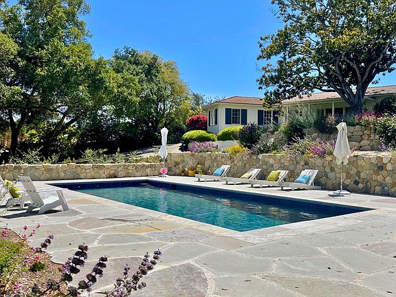 This charming 1940s ranch home in Hope Ranch is available fully furnished starting June for a year. Perched on a knoll with mature oaks on 1.5 acres, it offers mountain views and private beach access. The classic one-story layout includes 4 bedrooms and 4 bathrooms, with flexible living areas that open to the outdoors. Perfect for hosting guests or family, with tasteful furnishings for comfort and style. A spacious living room with fireplace adds cozy charm. Enjoy a new heated swimmer's pool, patios, gardens, and access to exclusive Hope Ranch horse trails and private beach your ideal Santa Barbara retreat!