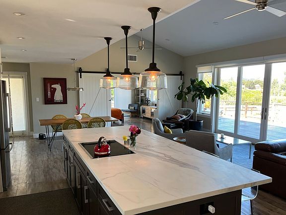 This modern farmhouse boasts an open floor plan, stainless steel appliances (dishwasher, microwave/oven, range, and refrigerator), a beautiful gas fireplace, and an abundance of windows that bathe the space in natural light. Includes a pool and an outdoor shower, along with a two-car garage (with EV charger), and 1000+ square-foot deck with stunning vineyard views and valley vistas. The property is fully fenced and features an apple orchard, along with persimmon, plum, and cherry trees.