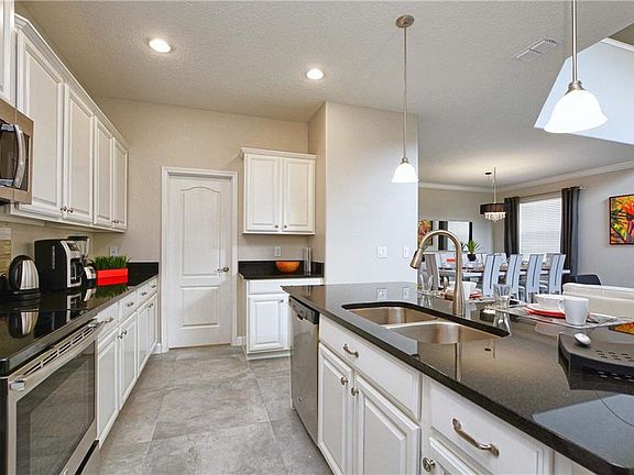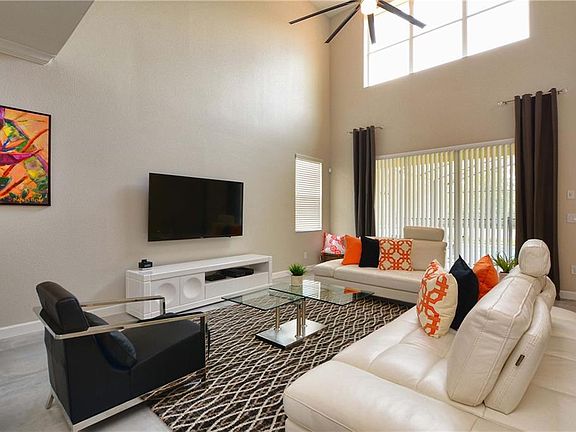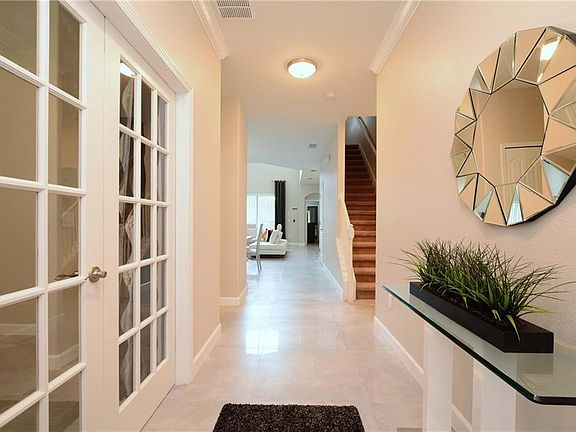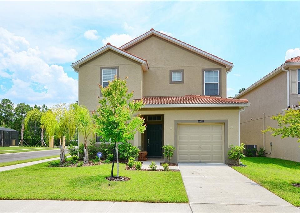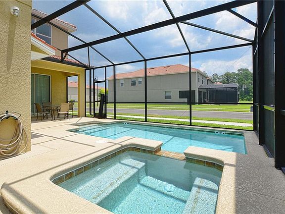 VERY UPGRADED AND FULLY FURNISHED VACATION HOME. Great location with no rear neighbors and south facing pool. Very quiet and private! View from patio and private pool to green lawns and trees. The home is professionally decorated and has upgraded marble floors and contemporary bathrooms. Flat screen TV in all bedrooms and living room, ceiling fans, ready for rentals. This beautiful 5 Bedroom/5 Bath Vacation Villa with Heated Splash Pool with spa and screen enclosure has 2 Master Suites. Located in the private gated resort community of Paradise Palms; just 10 minutes from Disney! This stunning villa was designed for luxury and has granite counter tops in the Kitchen and Bathrooms, clean stainless steel appliances, Wood Cabinets and marble tiles throughout the first floor. This decorated home includes all fine quality furnishings, linens and wares. Spend your days relaxing at the 9,500 square foot Club House featuring a Tiki Bar & Grill, waterfall resort style pool with a grotto/spa and a pool slide for the kids. A separate children's pool, movie theatre, game room, internet lounge, basketball court, tennis court, state-of-the-art fitness center & sauna, market, deli, beach volleyball and more. HOA fee includes resort amenities & staff, plus townhome cable, internet & phone, townhome's exterior care, pest control and Insurance. Paradise Palms Resort is zoned for short term rental and has a 24 hour manned security gated entrance.