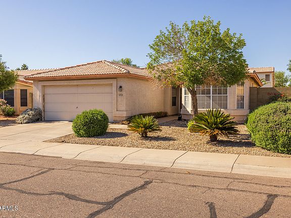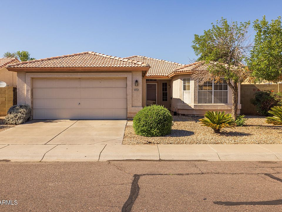 Well-maintained 3 bedroom, 2 bath home on a large homesite in an established neighborhood with no HOA! Open great room layout with split bedrooms, vaulted ceilings, tile, and laminate flooring throughout. The eat-in kitchen has a gas range and dishwasher, and the side-by-side refrigerator is negotiable. The primary bedroom has an en-suite bath with dual sink vanity, separate tub & shower and walk-in closet. Large backyard has a covered patio with roll-down shades and ceiling fan and easy-care desert landscaping with block fencing. Other features: newer A/C, newer water heater, newer interior paint, inside laundry room, bay window in one bedroom, and a 2-car garage with storage area.