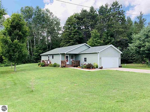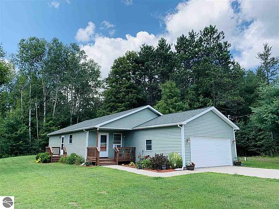 Affordable one level living! Built in 2006, this ranch style home is nestled among thousands of acres of Federal Land. Very well taken care of 3 bedroom, 2 bath home (optional 3rd plumbed in the laundry room), sits on just over an acre, surrounded by woods and is just 10 minutes from Cadillac West. Large open concept living room with an on demand fireplace and eat-in kitchen/dining area. Private master suite with walk in closet. Attached 2-car garage, private deck in the rear with a big yard and fire pit, and a covered front porch! Insulated crawl space with plastic vapor barrier floor. Great for dry storage. Conveniently located near snowmobile trails, skiing, hunting, fishing and lakes, this immaculately maintained ranch would be a great full time residence or a perfect up north vacation getaway! Just minutes from Caberfae Peaks Golf and Ski Resort!