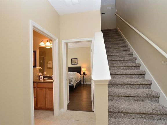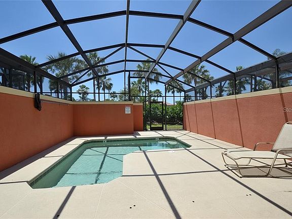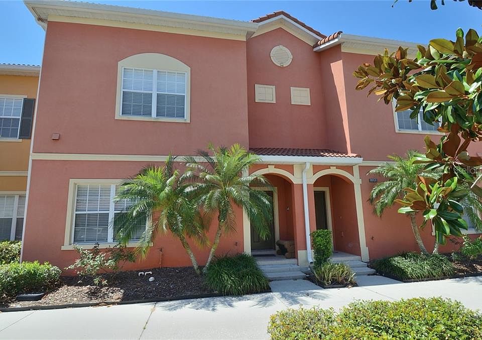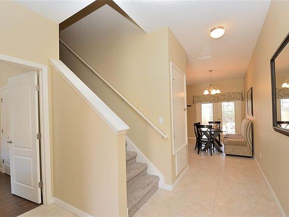 GREAT LOCATION, one of the best in the community with view to the great landscaping and palm trees! South facing patio/pool area! Close to clubhouse. Luxury vacation in Paradise Palms, Beautiful, spacious townhome in great turn-key condition. The home is sold fully furnished, Ready for rentals. The large patio has a Heated Splash Pool. Paradise Palms is private gated resort community. Just 10 minutes from Disney! Built in 2008 this stunning villa was designed for luxury and awaits you in this well appointed and tastefully decorated retreat with granite countertops in the Kitchen and Bathrooms, clean stainless steel appliances, Maple Wood Cabinets and 18" tile throughout the first floor. New carpet in stairs/hallway and wood floor in bedroom downstairs. This professionally decorated townhome includes all quality furnishings, linens and wares. Private heated pool with screen enclosure. Spend your days relaxing at the 9,500 square foot Club House featuring a TikiBar & Grill, waterfall resort style pool with a grotto/spa and a pool slide for the young ones. A separate children's pool area, movie theatre, game room, internet lounge, basketball court, tennis court, state-of-the-art fitness center & sauna, market, deli, beach volleyball and more. Dues includes resort amenities & staff, plus townhome cable, internet & phone, townhome's exterior care and insurance. Paradise Palms Resort is zoned for short term rental and has a 24 hour manned security gated entrance.
