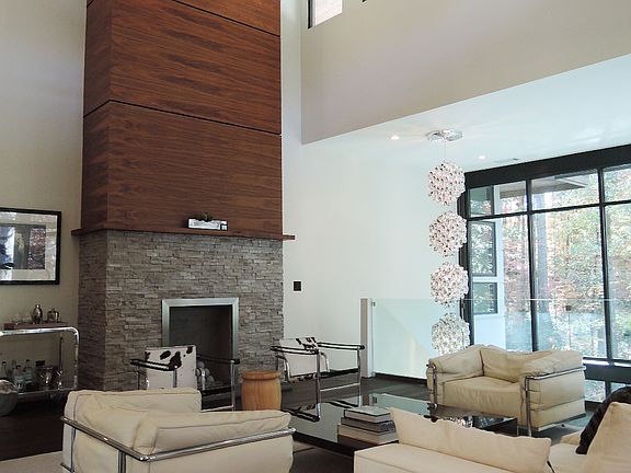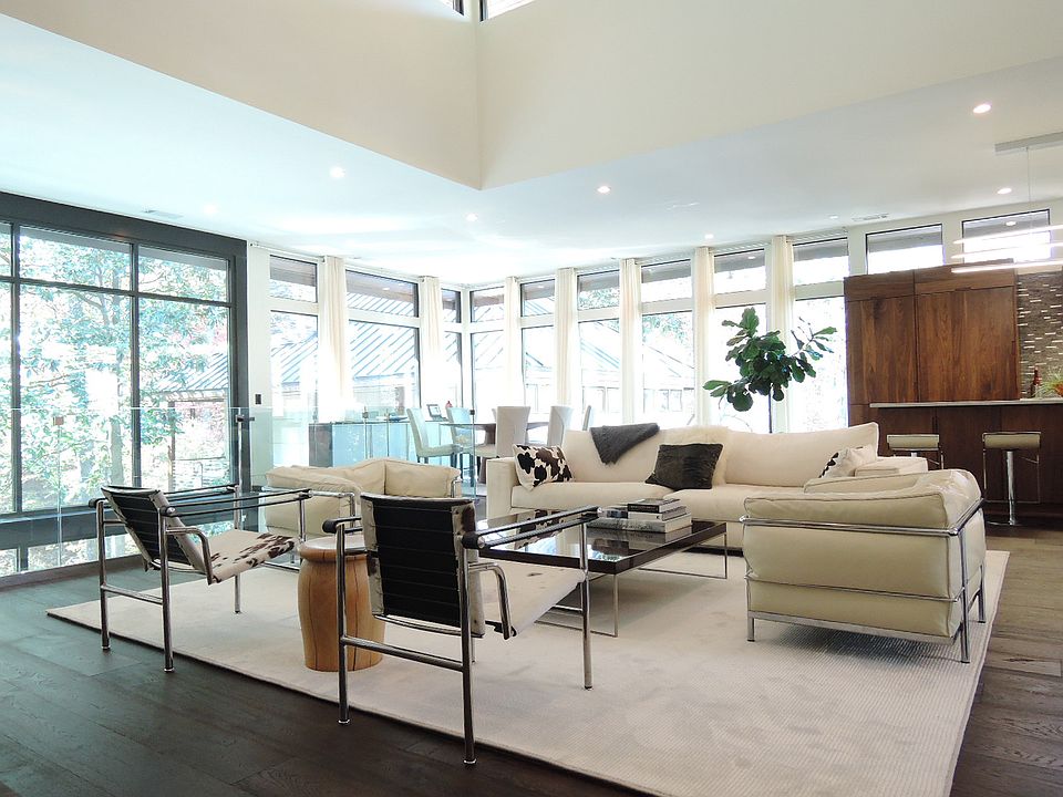 Representative of Frank Lloyd Wright's Prairie and Usonian periods, this mid-century modern gem features a renovated carriage house with first floor bedroom and modern bathroom, complete with new hardwood floors and floating barn style door with private exit from the bath to the two level deck that overlooks 2+ acres and an infinity pool, hot tub and fire pit. The second floor includes an in-law kitchen, updated floors, ceiling fans, fireplace and a modern window style, complete with clerestories, with the space functional as a generous in-law home, yoga studio or event space. The main house features four additional bedrooms (including two master suites), hardwood floors, modern black walnut cabinetry, dramatic glass walls overlooking the private woods, a large, expansive kitchen, generous master suite with steam room and modern free standing tub. The master suite and guest bedroom open to a private porch with fireplace. From the dramatic atrium, make your way to the terrace level which features a summer kitchen, open floor plan with third fireplace, pool room, sauna, second master suite, second laundry room and outdoor loggia that opens up to the carriage house and the infinity pool.