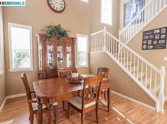 Fantastic home in popular Garin Ranch. 4 bedrooms, 1 bedroom & bath down stairs. Details throughout.. crown molding, wainscoting, designer two-tone paint. Updated bathrooms with decorative tile, laminate floors. Back yard with stamped concrete, patio cover, play structure shed. Garage with storage