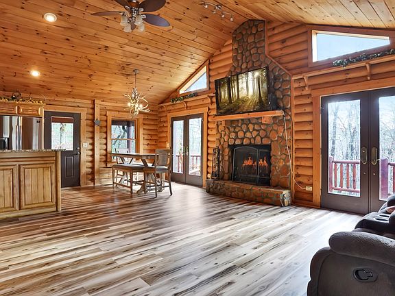 Complete privacy from this authentic log home! Step inside to find open concept living with an abundance of natural light, and a beautiful wood burning stone fireplace in the large great room. Adjacent kitchen offers granite countertops, stainless appliances & adjoining dining area. Main level offers spacious ensuite primary bedroom w/French door deck access, double vanities & walk in tile shower. Additional main level bedroom w/adjacent full bath features a modern soaking tub & laundry area. Travel down a spiral staircase to the full finished terrace level featuring 2 additional bedrooms, full bath and game area. Drive under basement garage offers storage or additional workshop space. Close to outdoor activities, hiking, trout fishing, this would make a fantastic rental or primary home!