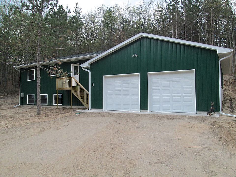Single story ranch with look out windows in the front of a partially finished basement. Additional outbuilding including a pole barn.