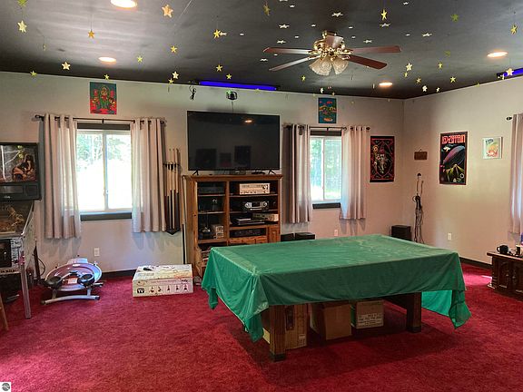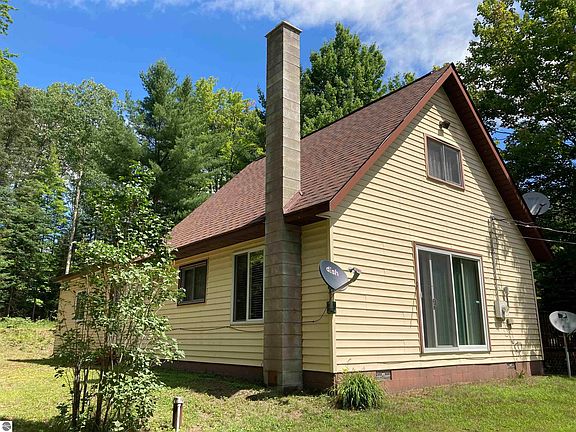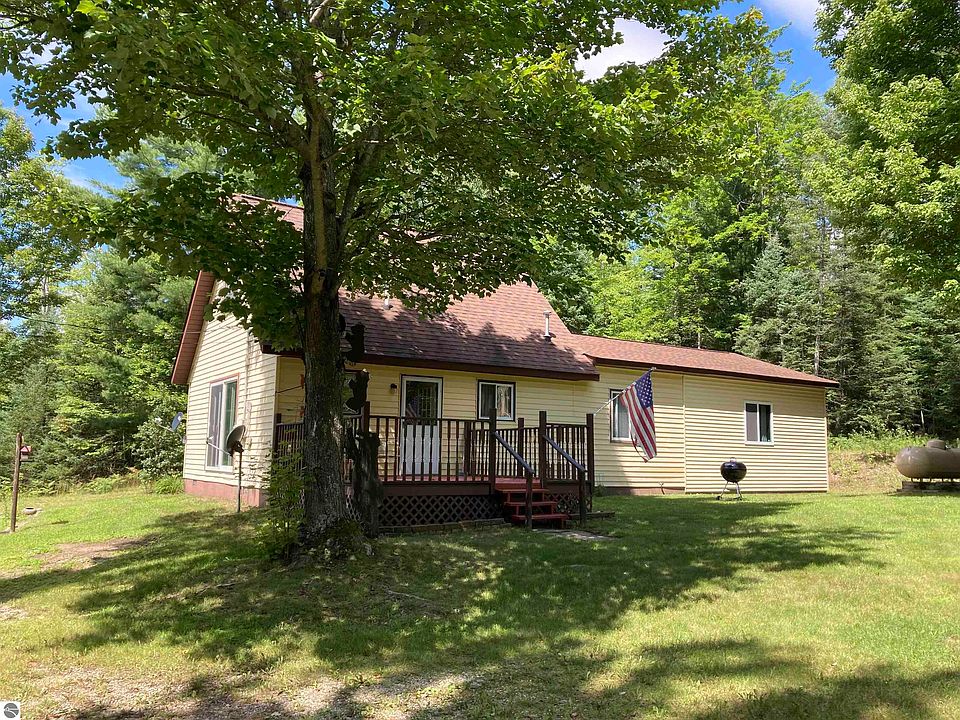 SUPER PRIVATE setting on a beautiful, square 10 acres! This chalet style home offers two bedrooms and a huge family/rec. room that could easily be converted into a large master bedroom if you need three. One full bath with utility area, masonry chimney with a free standing woodstove for chilly evenings, 24x40 insulated, heated, pole barn style garage that's awesome with plenty of room for a work area! Large storge shed, deck, paved county road, and close to Mio or Fairview. Whether it's year-round living, a summer home or a recreational get-a-way, this is worth checking out!
