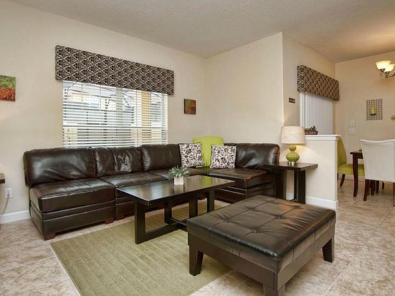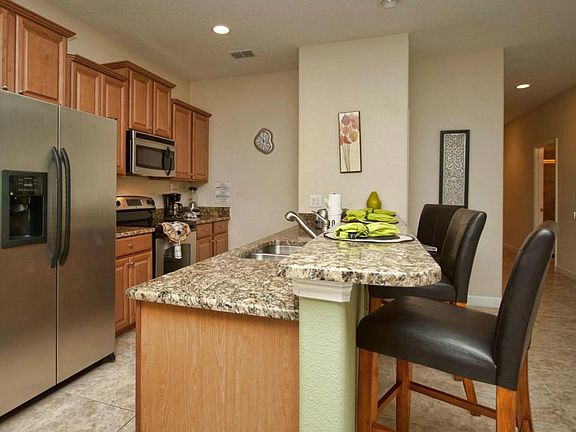 Beautiful, spacious townhome in immaculate turn-key condition. The home is professionally decorated with high quality furniture and painted with accent walls. This Paradise Palms unit comes fully furnished with all appliances. Features a king size bedroom and a full bathroom downstairs. 2 Master bedrooms on the second level. Flat screen TV in all bedrooms and living room, ceiling fans, ready for rentals. Sliding doors lead you to your own screened in Heated Splash Pool area with enough room to enjoy the sun or have a barbecue and relax outside. Patio/pool area is south facing with lots of sunshine, and is just a short walk to the clubhouse. Granite countertops in the Kitchen and Bathrooms, clean stainless steel appliances, Maple Wood Cabinets and 18" tile throughout the first floor. Spend your days relaxing at the 9,500 square foot Club House featuring a Tiki Bar & Grill, waterfall resort style pool with a grotto/spa and a pool slide for the young ones. A separate kid's pool, movie theatre, game room, internet lounge, basketball court, tennis court, state-of-the-art fitness center & sauna, market, deli, beach volleyball and more. HOA fee includes resort amenities & staff, plus townhome cable, internet & phone, townhome's exterior care, pest control and Insurance. Paradise Palms Resort is zoned for short term rental and has a 24 hour manned security gated entrance.