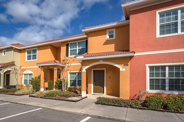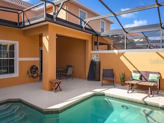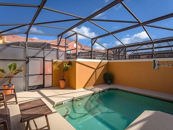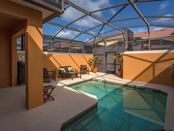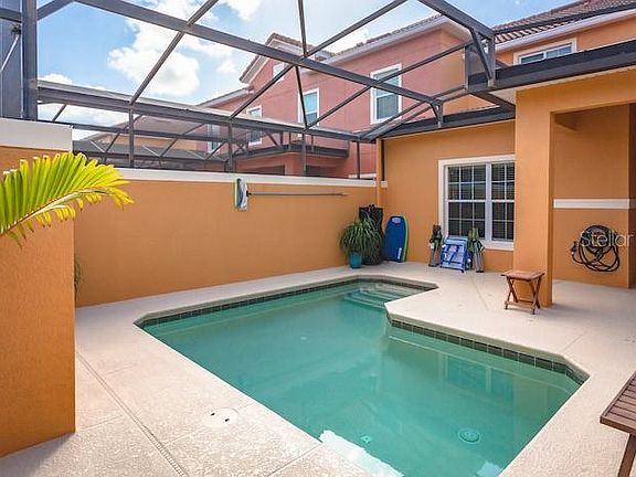 Welcome to this fully furnished 3 bed / 3 full bath Townhome with private pool, located in the wonderful resort-style community PARADISE PALMS RESORT. Investment property or Second Home. Great location close to the Clubhouse and all the community amenities. This is an income producing property that can be used as investment, personal use or vacation home. Granite countertops in the kitchen and bathrooms, stainless steel appliances and wood cabinets. One of the most popular floor plans in the community with one bedroom downstairs and two bedrooms with en-suite bathrooms upstairs. Outside a private patio with covered lanai provides access to the screened in pool with color-changing lights. The home has been well maintained. Paradise Palms is just minutes from Disney and has first class facilities including a 9,500 sf Clubhouse with restaurant, resort style pool, kiddies pool, game room with pool tables, air hockey and arcade, movie theater, basketball and tennis courts, fitness center, sauna, gift shop and ATM. The HOA fee includes cable, phone, high speed internet, trash valet, 24/7 security guard, landscaping, common grounds maintenance. This townhome can be used for short term rental, long-term, primary residence or second home. Don't miss this great opportunity!!
