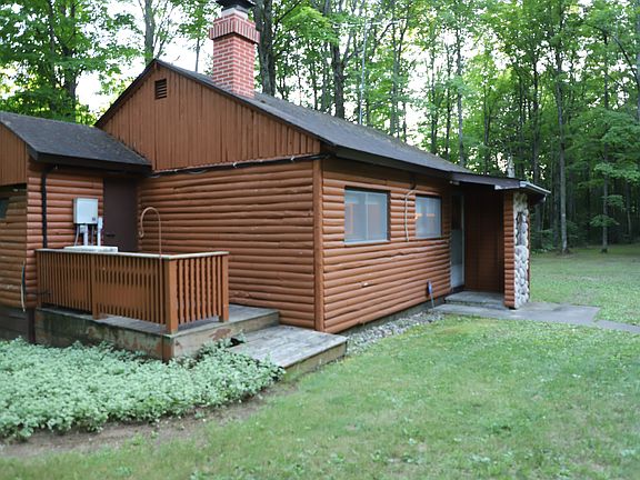 One of a kind modernized log style one bedroom cottage with living room and fireplace, full kitchen, full bath, tongue & groove pine walls, laminate floors, split system heat and central air, new roof & newly stained in 2020 & much more! Huge garage - pole barn building which is insulated and heated! Located on amazing wooded 6 acre parcel in the heart of Northern Michigan's greatest recreational areas with numerous inland lakes, snowmobile trails & public hunting property all within a stones throw! Property was previously a campground and screams of yesterday charm with fish cleaning station, wash house, electric & water pickets throughout property & even an old time path to the bath outhouse! Must see to appreciate this place!