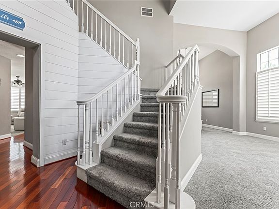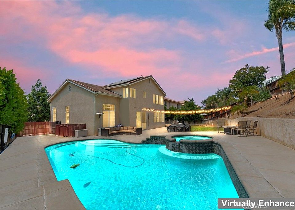 Four bed, 2 and 3/4 bath, 2 story Pool Home just walking distance from Rivera Elementary and Earhart Middle School in the highly desired neighborhood of Orangecrest. Double Doors open onto High Ceilings, Family and Dining rooms, Kitchen and Living room with Brazilian Cherry Wood Flooring, a Full Downstairs Bedroom and Bath, and laundry room. Fireplace is in the Living room. Open Kitchen is upgraded with White Floor-to-Ceiling Cabinets, dark grey Quartz Countertops, Large Marble Island with Farmhouse Sink, additional Dining Space, LED can lights, and Stainless Steel Appliances. Master Suite boasts Separate Tub and Walk-in Shower, Double Vanity with Two Sinks, and Walk-in Closet. Upstairs also hosts a Loft area and Hallway Storage Cabinets. Large Backyard is great for entertaining with Private Pool and Spa, a Built-in BBQ, plenty of Patio Space for outdoor seating, plus additional Lawn Space. A removable pool fence will be included. Plantation Shutters and Ceiling Fans throughout the home. Three-car Garage. Solar will be paid off at close of escrow. A ring doorbell and camera will also be included. Home is also equipped with two HVAC units and firehouse sprinklers. No HOA and low taxes. Thundersky Park, featuring walking paths, tennis courts, and a playground, is a short walk away. The popular Orange Terrace Park, featuring a sports park, community library, playground, and additional walking paths, is also within walking distance. Plenty of shopping and dining options are a short drive in all directions.