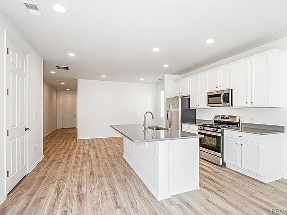 Just off the entry of this ranch-style new home, you'll find two generous bedrooms flanking a full bath. You'll also appreciate open dining and great rooms, an adjacent tech center and a well-appointed kitchen with a center island and roomy pantry. Other highlights include a central laundry with a washer and dryer, a private master suite with an oversized walk-in closet and attached bath, and a relaxing covered patio with gas line to BBQ and Range. This inviting home faces North East and is adjacent to open space while backing to friendly neighbors. It includes stone accents and professional front yard landscaping with a sprinkler system. Living in Belle Creek means you experience a low tax rate. Only 1.15%! No HOA fee and free access to the local YMCA; The community is conveniently located near golf courses and the Rocky Mountain National Wildlife Refuge, and is just a short commute to downtown Denver and DIA.