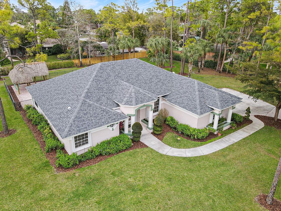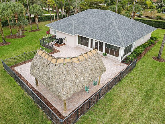 Venture through the electric gate into your exclusive, private retreat. Tall hedges and fencing fully surround this scenic property which is graced by lush landscaping and mature fruit trees including mango, avocado and peach. Tucked in a wonderful equestrian neighborhood on a beautiful corner lot, this magnificent home sits on over 1 acre and includes so many upgrades and desirable features.Living here is a pleasure as perfectly conceptualized interior and exterior spaces present wonderful ease of relaxing or entertaining. Amazing details such as custom built-in shelving, six panel doors, lofty vaulted ceilings, ambient recessed lighting and high-end finishes are found throughout. The main living boasts a spacious and bright open concept with three sets of French doors (SEE SUPPLEMENT)