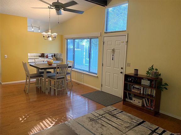 End unit ranch 3 bedroom, 2 full bath townhome in established neighborhood. Surrounded by beautiful mature shade trees. Kitchen features granite countertop with undermount stainless sink, large pantry, microwave, hardwood floor, and tile backsplash. An inviting vaulted great room features a faux stone fireplace with mantle, hardwood floor and Dining space. Finished basement with separate living space. Private fenced backyard with gate access to greenbelt has a stamped concrete 14 x 13 patio, 13 x 10 Deck and artificial lawn. A 1 car, deeded garage is located near the home and also 1 reserved space. Radon mitigation system, 3 ceiling fans, a 90% efficient furnace with humidifier and Central AC. Clubhouse, pool, 2 tennis courts, basketball court, playground and seasonal hot tub. Yard has access gate to greenbelt connect with hiking/biking and miles of trails to Standley Lake and Dry Creek. Conveniently close to shopping, public transit and a variety of restaurants and shops.