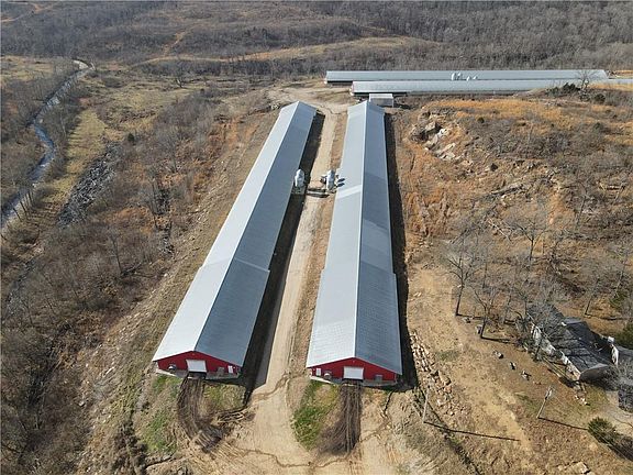 Farm with a view. this 4 house farm located in the country just off pavement is surrounded by beauty. (3) 55 x 600 and (1) 55 x 550 Tyson broiler houses new in 2016. Well water with rural water backup. 2 bedroom home with large shop. Oversized brand new stacking shed. Room for additional houses.