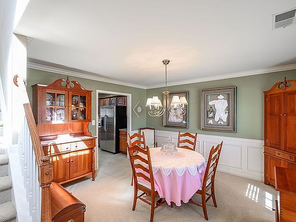 Large great room, fireplace with gas logs, surround sound speakers, soaring vaulted ceiling with loads of natural light. Eat in kitchen features tile floor including breakfast area. Abundant upgraded cabinetry, pantry and stainless steel appliances. Dishwasher and disposal included. Formal dining room highlighted with wainscoting, chair rail, and crown molding. First floor owners suite. Impressive tray ceiling, recessed lights and full bath with separate toilet room, jetted tub, separate shower, double sinks and walk in closet. Bonus room over the garage finished with wood laminate flooring makes a perfect office or playroom. Zoned heat/air systems feature gas furnace on first floor and electric heat pump on second floor for added efficiency. 10’x18’ deck and additional 8’x10’ concrete patio allows for plenty of room to entertain or relax in this quiet green space.