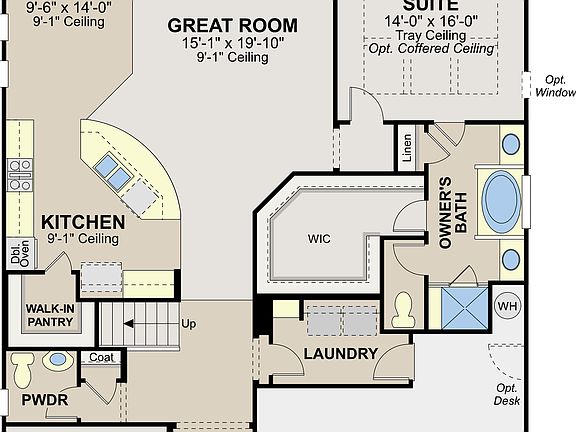 The fabulous gourmet kitchen in this home includes a radius island which opens to the great room. This owner's suite down plan offers a luxury owner's bath and also features a 2-car garage, 3 bedrooms, 2.5 baths, first floor flex space, spacious great room, and loft.