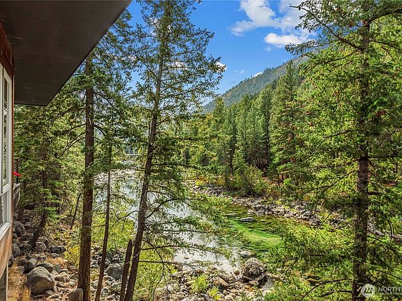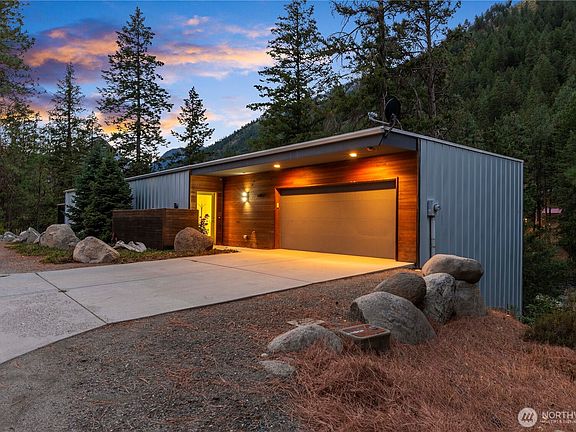 Set in one of Leavenworth’s most desirable riverfront locations, this Contemporary Modern home offers 357 feet of Wenatchee River frontage on a long, rectangular lot that provides a rare sense of privacy. Designed by Syndicate Smith and built by Hebert Construction, the residence features a 2-bedroom, 2-bath layout with bonus room, an open floor plan, custom cabinetry by Tom Peckham, expansive view windows, and a striking gallery wall. Enjoy river views from the covered deck, while the primary suite opens to a private deck and hot tub. The spa-like ensuite includes a double vanity, tile shower, and heated floors. TimberTech low-maintenance decking and an oversized 2-car garage complete this thoughtfully designed waterfront retreat. Walk to downtown Leavenworth, step next door to the golf course, enjoy your own riverfront access, and reach the Icicle Ridge Trailhead in minutes.